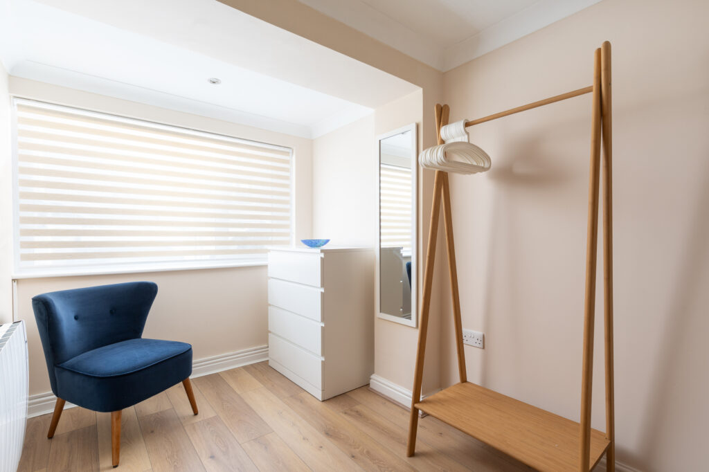 The bedroom features a comfortable double bed, complemented by stylish wooden furniture, including a clothes rail and chest of drawers. A blue velvet chair adds a pop of colour to the room, and artwork by Jo Downs adds to the calming atmosphere. A column fan is available, ensuring comfort on warm days.
